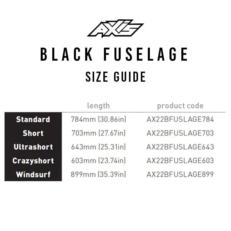 Compatible with all but the HPS, ART, and the smaller BSC wings and compatible with both the Axis Aluminium and Carbon masts. Available in Standard, Short, Ultrashort, Crazyshort and Windsurf sizes. Go longer for stability, shorter for manoeuvrability. With the modular nature of the AXIS system, it’s easy to progress to shorter fuselage lengths over time without having to change any other component.