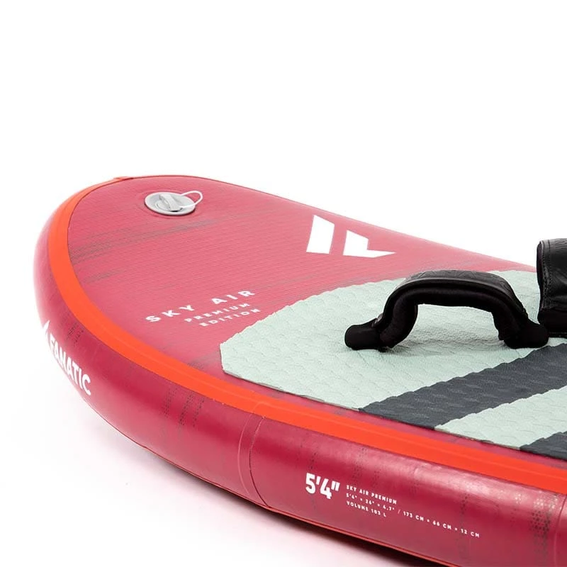 No compromise on comfort and riding sensation in a compact package! The Sky Air Premium offers an incredibly stable flight. The extra rigid Carbon plate directly under the riders feet, makes sure the foil follows every command instantly. The shape features a pronounced nose rocker making sure touchdowns won’t stop the fun. Fanatic have added all the additional features such as a bottom handle/slot to carry the board and wing into the water at the same time, footstrap inserts and a silicon rail edge for a clean release and early take off. The board is built in Premium Double Layer construction is supplied with a very practical wheely backpack that has room for your board, foil, wing and Fanatic Double Action pump, which you can use to inflate both your board and your wing.