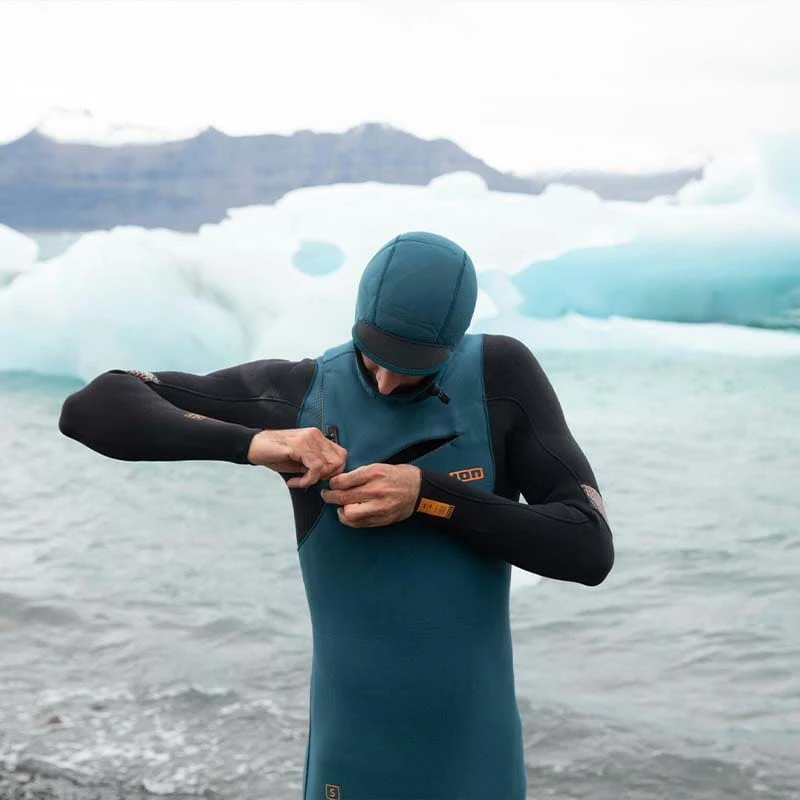 The Amp range uses a new neoprene material called i_ foam which is an extreme lightweight and stretchy neoprene foam. it partly consists of oystershell powder. Thanks to its lower density it contributes to heat insulation and better flexibility. Max_Flex & eco stretch allows for the same stretch with less effort. Hence providing more flexibility and less pressure on the forearms. Eco-Stretch is sourced from nylon waste. The best thing is that stretch properties are just as good as in conventional linings. Additionally, recycled Eco_Stretch lining at the torso and legs maintains comfy stretch throughout the entire suit (black colorway only). The secret for optimal heat retention lies in ION’s super flexible Hot_Stuff 2.0 thermo lining combined with toasty warm Plasma_Plush 2.0. On top, I_foam neoprene traps more air due to its foamy structure, improving heat retention and flexibility. To guarantee maximum heat, the hood is not detachable. Another feature that shelters you from icy showers is a small silicone print at the front zip opening area. It increases the connection between the flap and the rest of the wetsuit.