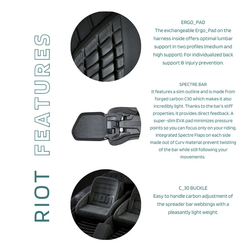 The ION Riot Curv harness ergonomics provide the perfect fit for each individual’s body size and shape. The harness outline derives from body height and girth, ranging from high to low with intermediate sizes. The exchangeable Ergo_Pad on the inside offers optimal lumbar support in two profiles. The Riot Curv harness comes with two options – medium and high support to enable you to choose which one suits you best. The Riot Curv harness is a stiff range stiffness/flex (flex index 14) and offers a direct and agile feeling. An ultra-lightweight Curv construction distributes forces evenly throughout the harness. At the same time, it’s flexible enough to allow for perfect freedom of movement. Non-water-absorbent Hyer_Foam contributes to the overall ergonomic fit and lightweight while the Neoprene_Belt provides flexibility in the front. ION’s sleek Spectre Spreader Bar (including kite hook) completes the Riot Curv. Its Curv_Flaps create a seamless and optimal force distribution throughout the harness. Comes with integrated Knite_Knife Multitool 2.0 and HPL_Slider.